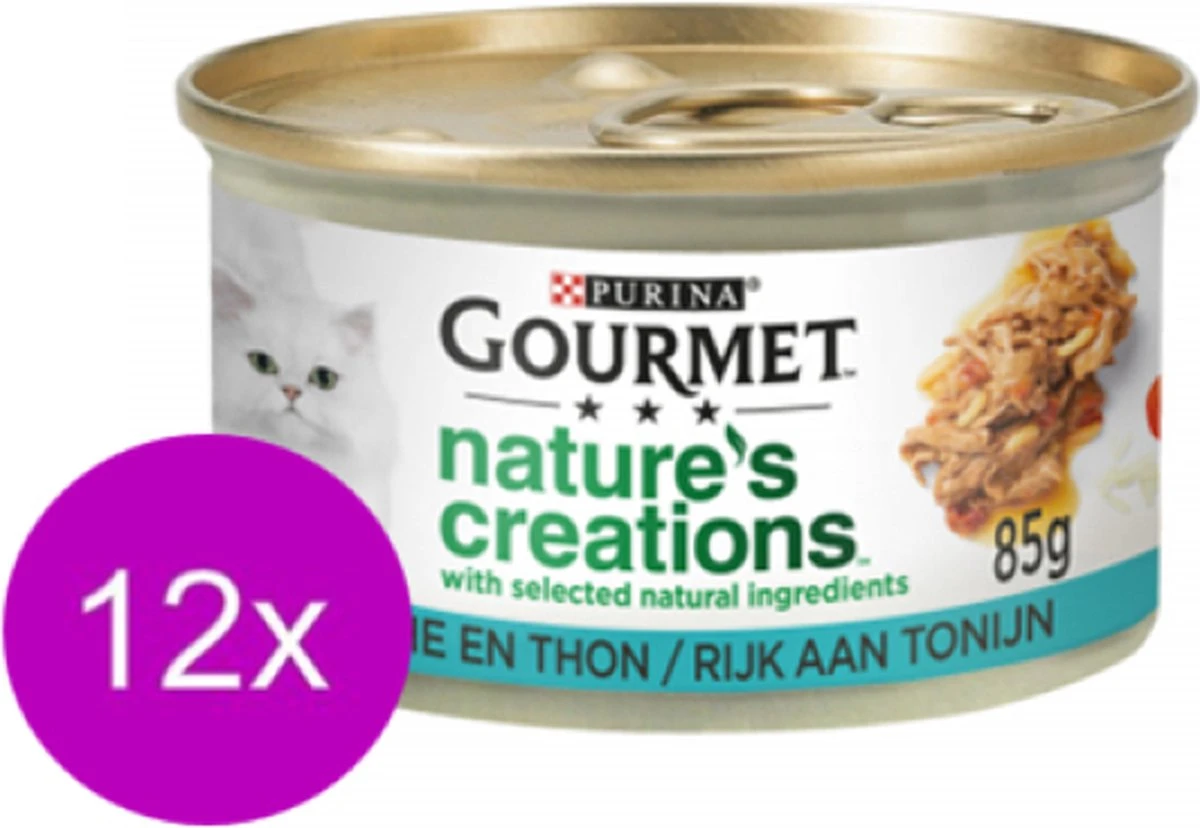GOURMET™ Nature’s Creations™ is een collectie van heerlijke recepten geïnspireerd door de natuur. Deze recepten komen samen door een reeks geselecteerde natuurlijke ingrediënten te combineren om zelfs de meest kieskeurige katten te plezieren. Als jouw kat een verworven smaak voor vis heeft, zal hij zeker genieten van dit recept: PURINA GOURMET™ Nature’s Creations™ langzaam gegaarde Mini Filets, rijk aan tonijn, gegarneerd met tomaten en rijst. Een voortreffelijke hoofdmaaltijd die hem vanaf de eerste hap zal verleiden. Elk gerecht wordt rechtstreeks van blik naar kom gegoten en wordt geleverd in een eigen blik van 85g, met behoud van smaak en textuur, zodat elke maaltijd net zo lekker is als de vorige. Een voortreffelijk feest voor jouw fijnproever…