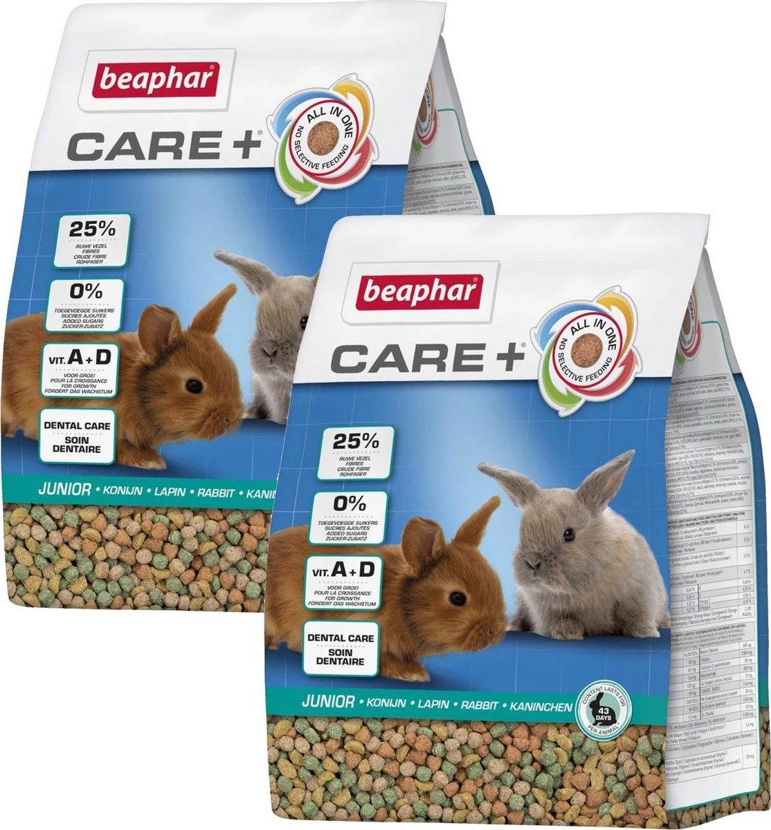 Care+ Konijn junior is een smaakvolle en volledig uitgebalanceerde voeding. De voeding is geΓ«xtrudeerd waardoor de eiwitten makkelijk verteerbaar zijn. Erg lekker en gezond. Care+ is een smaakvolle en volledig uitgebalanceerde voeding. Het voer is geΓ«xtrudeerd, waardoor eiwitten zeer licht verteerbaar zijn. Ieder brokje heeft dezelfde samenstelling zodat voedingstekorten en restjes niet meer voorkomen. Echinacea en Spirulina beschermen tegen ziekten. Bevat gecheleerde mineralen voor een betere mineralenbalans. FOS en MOS verbeteren de darmflora en Yucca Schidigera beperkt de geur van ontlasting en urineβ¦..De harde brokjes ondersteunen de natuurlijke slijtage van de tanden (Dental Function) en de grootte van de brokjes is specifiek afgestemd op jonge dieren. De brokjes bevatten verder de juiste hoeveelheden vitamine A en calcium voor een optimale groei en ontwikkeling. Met Vitamine E voor de lichaamscellen, het juiste ruwvezelgehalte en smakelijke kruiden. Ook geschikt voor voedsters tijdens dracht en spenen..- Voor levensfase: JUNIOR.- Inhoud: 1,5 KG.- Geleverd per: 2 ST Γ 1,5 KG