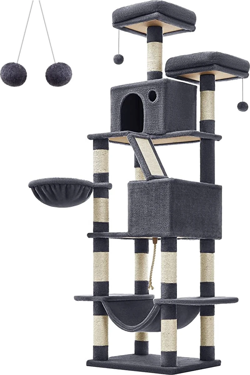 Hoppa! Krabpaal, 206cm Hoge Krabpaal Met 13 Krabpalen, 1 Krabhelling, 2 Platforms, 2 Grotten, Mand, Hangmat, Pompons, Kattenkrabpaal Met Meerdere Niveaus Voor Grote Katten, Rookgrijs
