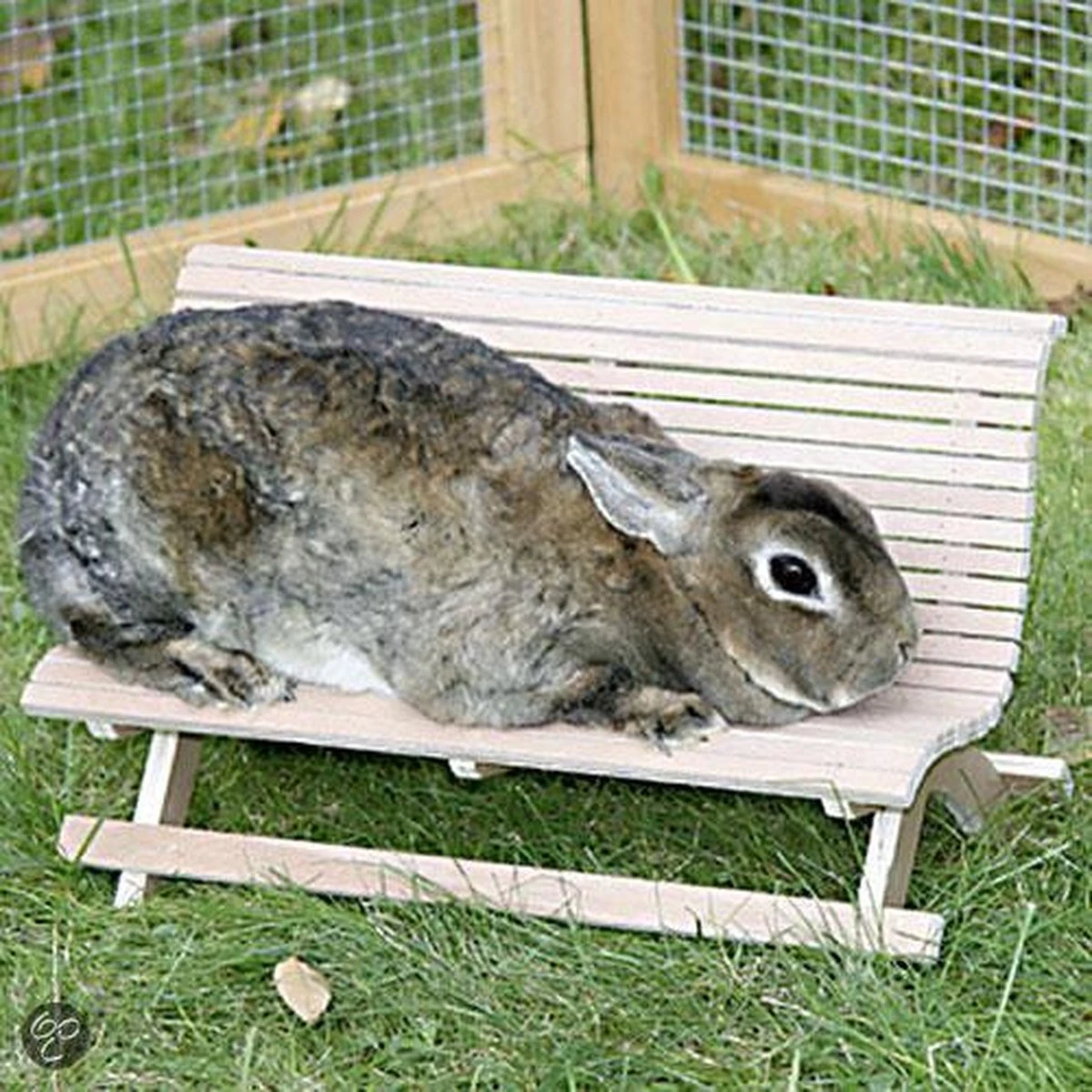 Bankje voor in het knaagdierenhok. Een onmisbaar fraai stukje werk!Geschikt voor konijnen. Afmetingen: 30x15x18 cm