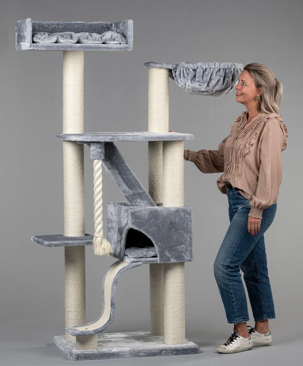 Krabpaal grote katten Kilimandjaro de Luxe licht grijs voor grote katten is met ca 49K een zeer stevige RHRQuality krabpaal met extra dikke 12cm diameter sisalpalen met alles wat een kat zich kan wensen. Zeer stabiel en 192 cm hoog met heerlijke hoge enorme (60x43cm) directiezetel met uitneembaar en wasbaar kussen en een hangmat de Luxe ( combinatie tussen kussen en hangmat) met ligplek van 45cm diameter. Hangmat heeft dikke metalen rand en kan eenvoudig tot 20 KG draaggewicht aan.