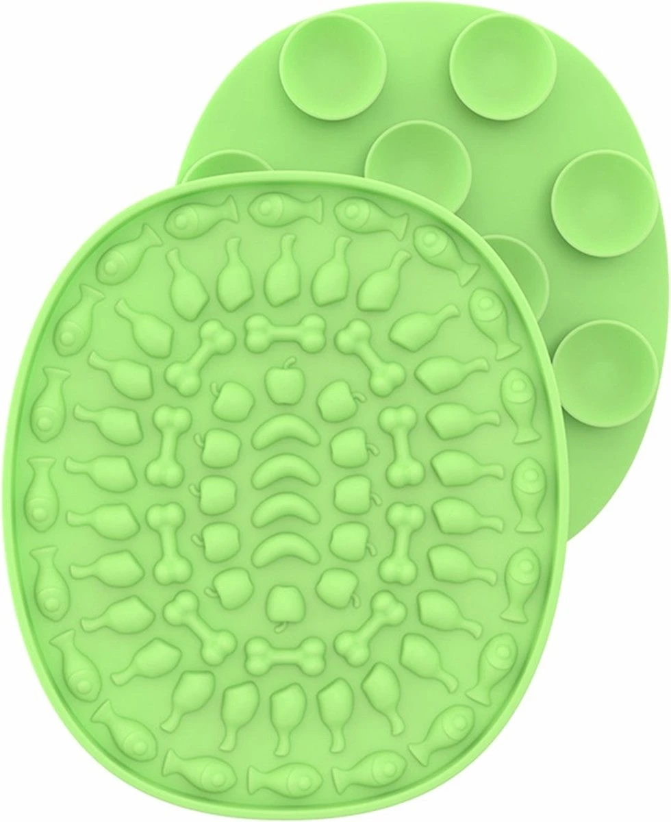 Een likmat voor honden is een handig hulpmiddel om het geven van lekkernijen en voeding aan je hond leuker en interactiever te maken. Deze specifieke likmat is groen van kleur en speciaal ontworpen om het likken te bevorderen en het stimuleren van de zintuigen van de hond.