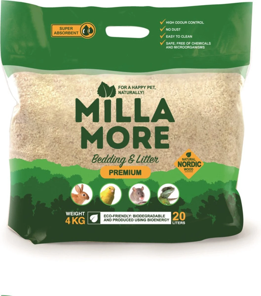 MILLAMORE beddengoed is speciaal gemaakt voor gebruik met dieren. Het heeft een uitstekend absorptievermogen en geurcontrole. De producten zijn veilig en getest in een laboratorium – het hout bevat geen pathogene bacteriën of giftige chemische verbindingen. De producten zijn stofvrij en gemaakt van espenhout met een zeer laag harsgehalte. De producten bevatten geen chemische toevoegingen of restanten uit de hout- of papierindustrie.