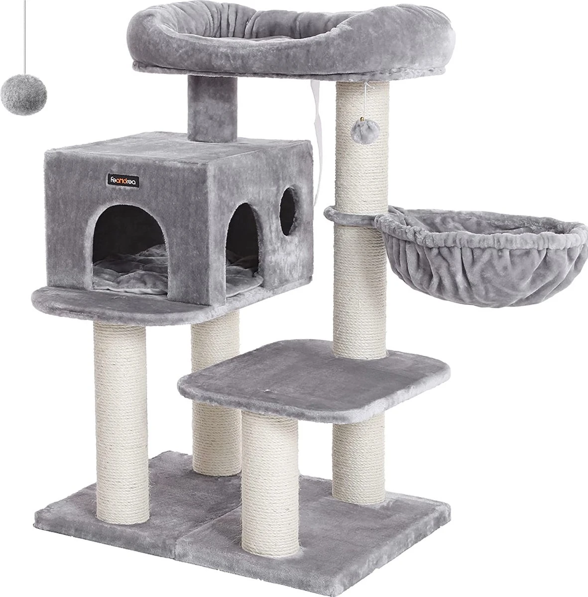 Deze kattenboom is voorzien van beweegbare vloerelementen die u in verschillende richtingen kunt verstellen. Dit ruimtebesparende kattenspeelgoed past zich dus perfect aan de omstandigheden in uw huis aan