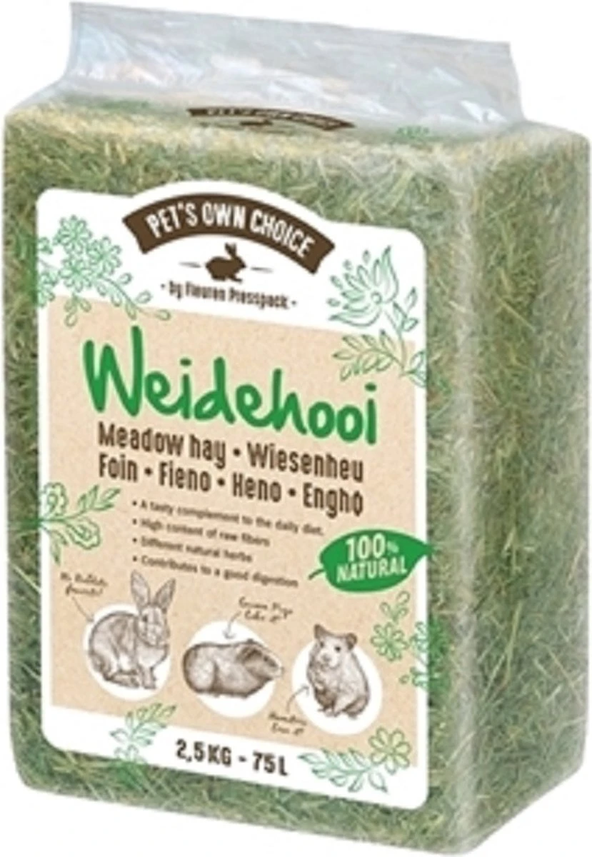 Hooi is essentieel voer voor konijnen en knaagdieren. Door de ruwe vezels heeft hooi een positief effect op het gebit en de darmwerking van jouw dier. Door de ruwe vezels moeten blijven de darmen van jouw konijn constant in beweging, wat essentieel is voor een gezond konijn. Daarnaast moet het konijn langdurig kauwen op het hooi, wat helpt de kiezen op de juiste manier af te slijten. De kiezen van een konijn groeien gedurende zijn hele leven door en daarom is het belangrijk dat jouw konijn veel goed hooi tot zijn beschikking heeft. Ook gaat hooi verveling tegen; dieren zijn lang bezig om het op te eten, en daarnaast nestelen bijvoorbeeld caviaβs, muizen en hamsters er graag in. Met dit hooi van Petβs Own Choice biedt jij jouw konijn lekker voer en voldoende afleiding die helpt zijn gezondheid op peil te houden.