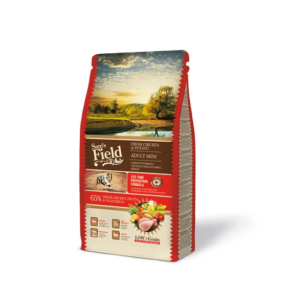 Sam’s Field Adult Mini Chicken & Potato is verkrijgbaar in 2,5 en 8 kg.